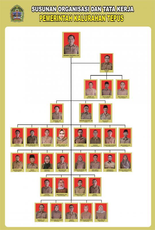Susunan Organisasi dan Tata Kerja Pemerintah Kalurahan Tepus berdasarkan pada Peraturan Bupati Gunungkidul Nomor 73 Tahun 2019.