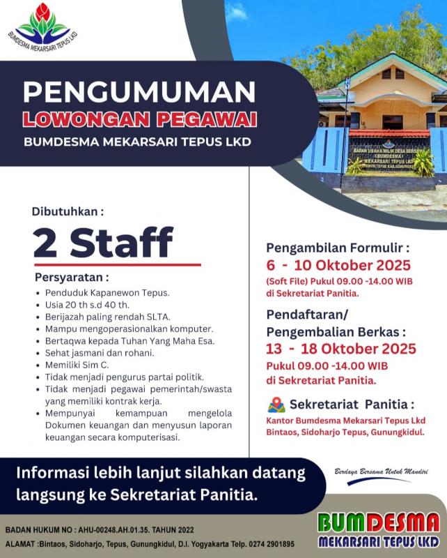 Tepus (desatepus.gunungkidulkab.go.id) - BUMDESMA MEKARSARI Tepus LKD membuka lowongan pegawai sejumlah 2 orang staf melalui rekrutmen secara terbuka. Pengumuman secara resmi diterbitkan mulai hari ini untuk diketahui masyarakat secara luas.