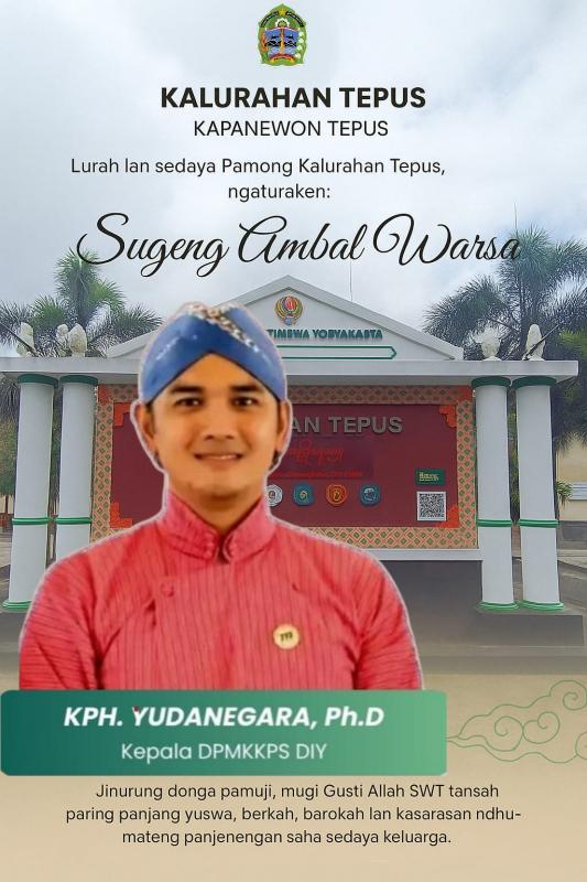 Pemerintah Kalurahan Tepus ngaturaken 'sugeng ambal warsa dhumateng Kanjeng Pangeran Haryo H. Yudanegara, SE, M.Si., Ph.D, Kepala Dinas Pemberdayaan Masyarakat Kalurahan, Kependudukan, dan Pencatatan Sipil (DPMKKPS) Daerah Istimewa Yogyakarta.