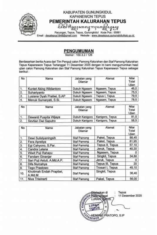 - Dikukuhkan Lurah Tepus, Sunanta, S.Kep Menjadi Ketua Tim Penguji Calon Pamong dan Staf Tahun 2025