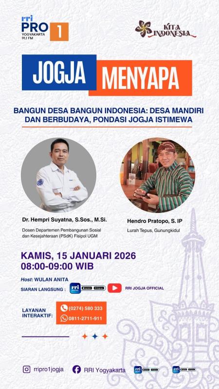 Tepus (desatepus.gunungkidulkab.go.id) - Lurah Tepus, Bapak Hendro Pratopo, S.IP, dijadwalkan hadir sebagai narasumber dalam program siaran radio "Jogja Menyapa" yang diselenggarakan oleh RRI Pro 1 Yogyakarta 91.1 FM. Acara ini akan berlangsung secara langsung pada hari Kamis, 15 Januari 2026, mulai pukul 08.00 hingga 09.00 WIB.