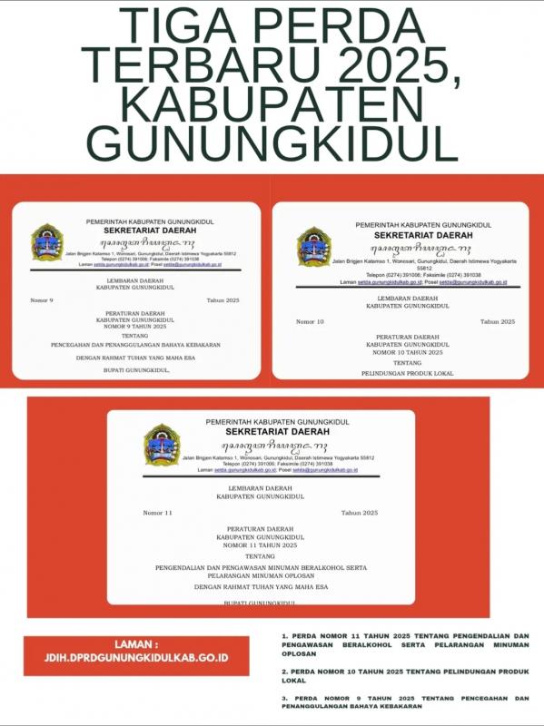 Tepus (desatepus.gunungkidulkab.go.id) - Pemerintah Kabupaten Gunungkidul telah mengeluarkan tiga Peraturan Daerah (Perda) terbaru pada tahun 2025 yang berdampak pada kehidupan masyarakat, termasuk di Kalurahan Tepus. Berikut rincian ketiga Perda tersebut: