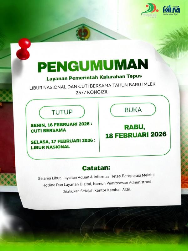 Kalurahan Tepus mengumumkan penutupan layanan pemerintahan dalam rangka Hari Raya Tahun Baru Imlek 2577 Kongizili, dengan jadwal sebagai berikut: