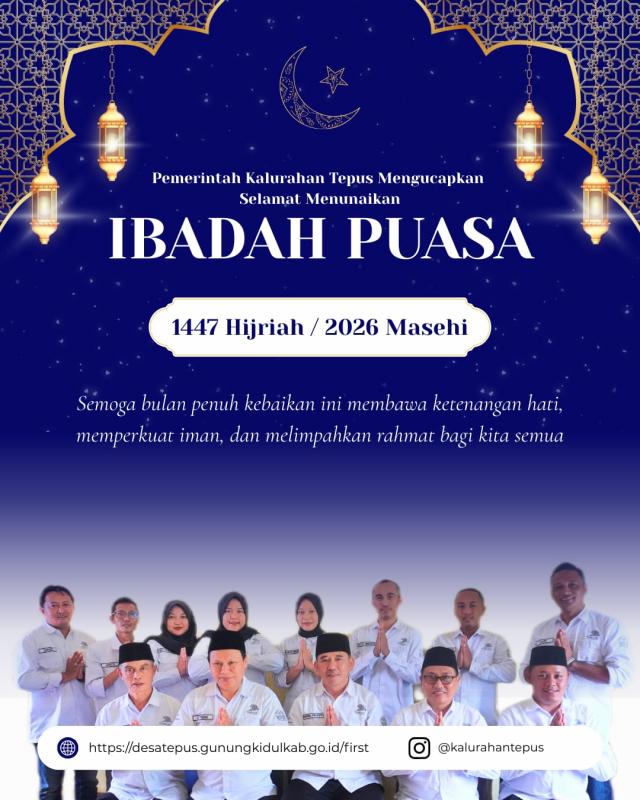Tepus (desatepus.gunungkidulkab.go.id) - Atas nama Pemerintah Kalurahan Tepus, mengucapkan Selamat Menjalankan Ibadah Puasa di Bulan Ramadhan 1447 H. Kedatangan bulan suci Ramadhan membawa keberkahan bagi kita semua.