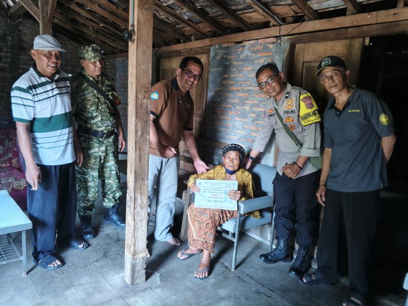 Salah satu penerima manfaat, Ibu Sani, menerima bantuan secara langsung di kediamannya sebagai bentuk perhatian khusus kepada warga lansia yang memiliki keterbatasan untuk hadir di balai kalurahan.